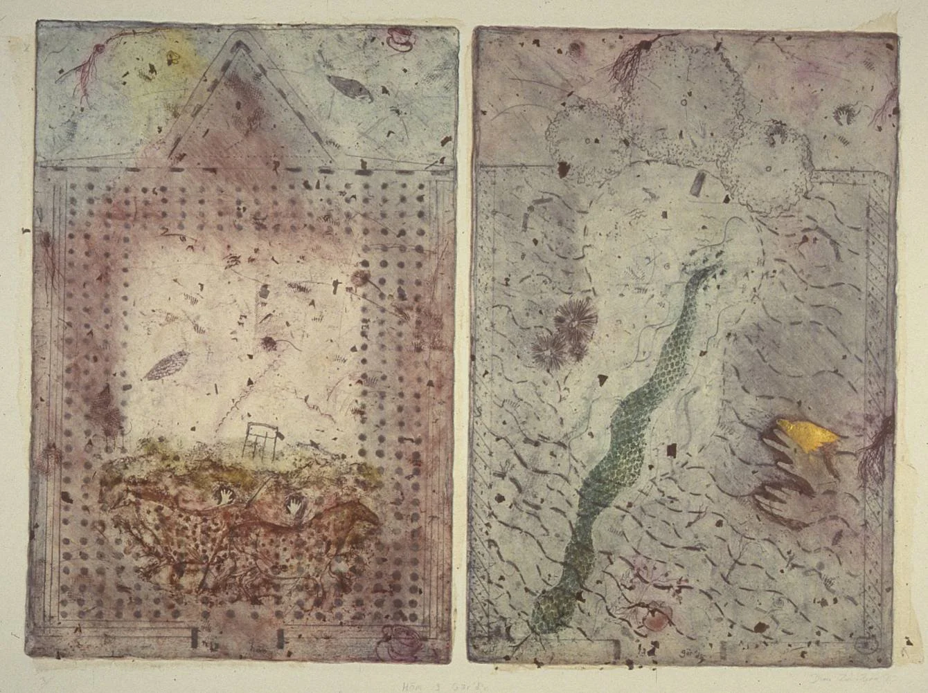 Hōm & Gärd’n Etching, collage, gold leaf, on paper 22” x 30” 1986