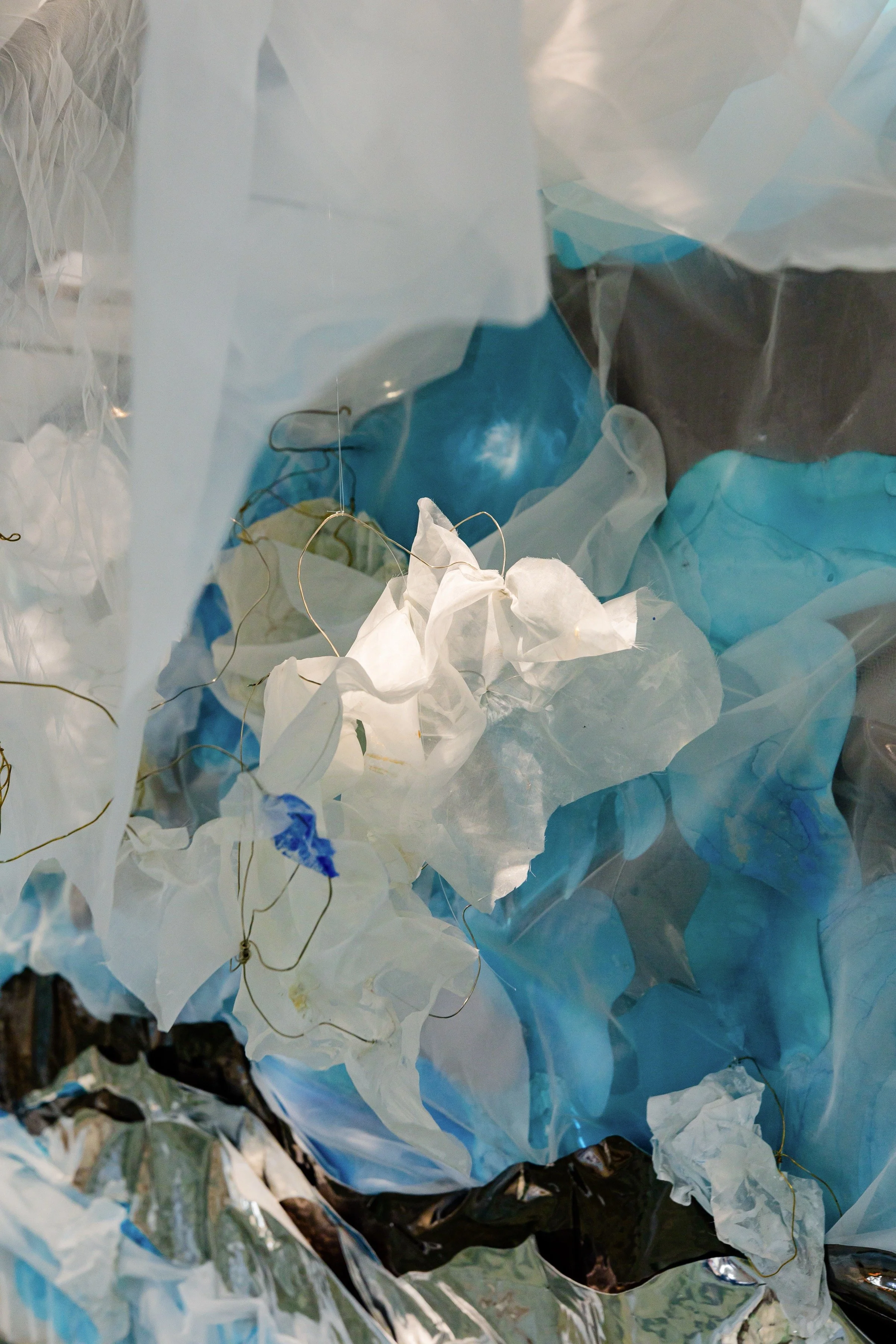 A plein-air interpretation of landscape, is replaced by a process that alters all the data (photographs, drawings, found objects and memory) into a new material story. The pieces are altered and assembled into a dimensional collage. I drawing gesturally with wire; stretching fabric, paper, and photographs like a skin over a linear skeleton.